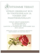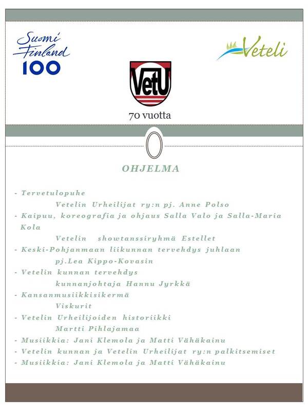 Vetelin Urheilijat ry. täyttää tänä vuonna 70 vuotta! Juhlavuoden kunniaksi urheilukauden päätöstilaisuus pidetään yhdessä kunnan palkitsemistilaisuuden kanssa. Samalla juhlistetaan Suomen 100-vuotista taivalta! Juhlatilaisuus järjestetään sunnuntaina 3.12. alkaen klo 18 kakkukahveilla. Varsinainen ohjelma alkaa klo 18.30. Paikkana Vetelin urheilutalo. Ohjelmassa puheita, historiaa ja musiikkia ja tietenkin menestyneiden urheilijoiden palkitsemiset ja muut muistamiset. Tarkempi ohjelma päivitetään myöhemmin. Kutsu on avoin, joten kaikki ovat lämpimästi tervetulleita! |